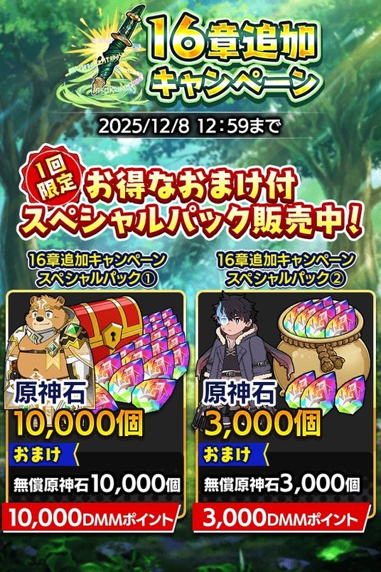 16章追加を記念して章更新限定キャラクター、パラレルIF限定キャラクターがそれぞれセレクトSTEPUPガチャで登場する「16章追加CP 章更新限定入りセレクトSSR確定STEPUPガチャ」、「16章追加CP パラレルIF限定セレクトSSR確定STEPUPガチャ」や、「レマイアス」スキンを獲得できるバックを復刻した「16章追加CP 復刻「レマイアス」スキンパック」、また、1回購入限定の「16章追加キャンペーン」スペシャルパックが2種期間限定で登場!この機会をお見逃しなく!