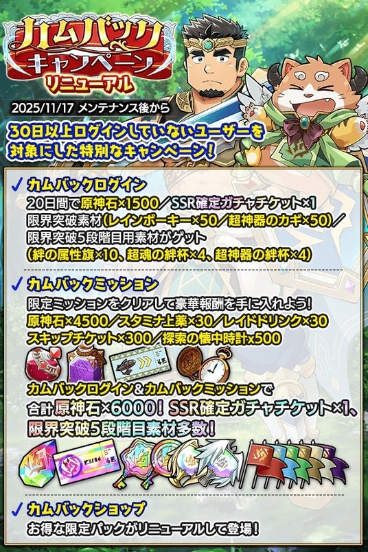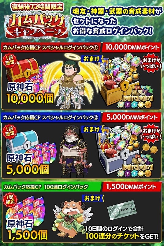 Lv90まで強化済みの即戦力魂友・神器を選べる「カムバック応援キャンペーン 即戦力SSRセレクトSTEPUPガチャ」、魂友・神器・武器の育成素材がセットになったお得なカムバック応援CP ログインパック各種も登場!