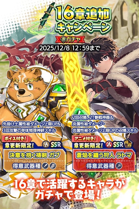 SSR魂友「決意を抱く祷剣 ガブ」とSSR神器「蒼焔を纏う狩人 ラトマ」がピックアップされた「16章追加キャンペーンガチャ」をお見逃しなく。