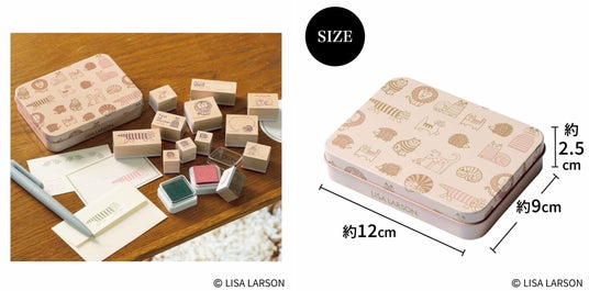 単体でも組み合わせても楽しい12種類のスタンプと、少しくすんだピンクとグリーンの2色のインクがブリキのケースにぴったり収納!