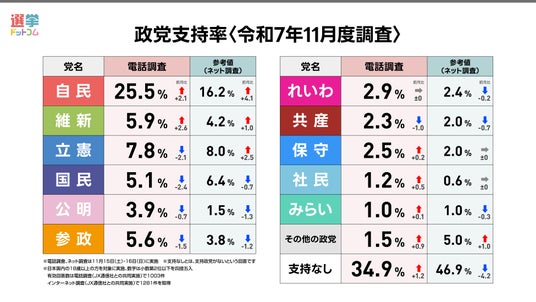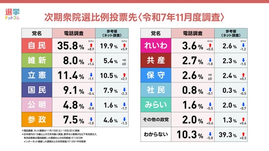 今月は高市内閣発足、自民党と日本維新の会による連立政権が樹立されてから初めての調査となります。電話調査では自民が前月より2.1ポイント持ち直し、維新は2.6ポイント増となりました。