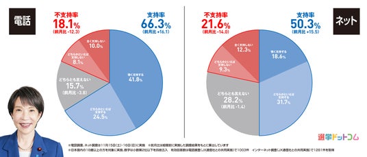 組閣前に実施した先月の調査と比較すると、支持率はさらに上昇して電話・ネット調査ともに半数を超えました。特に電話調査では、「強く支持する」が4割を占めています。不支持率と「どちらとも言えない」は前月比より減りました。