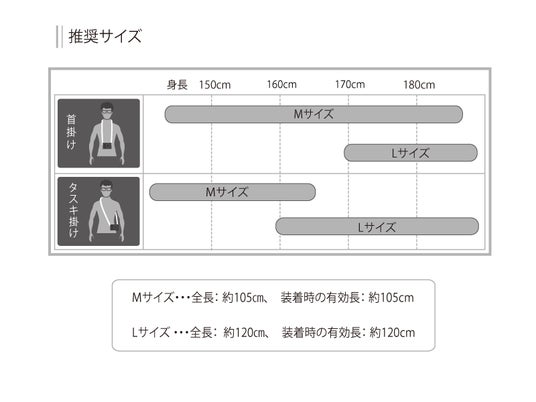 Mサイズ(105cm)・Lサイズ(120cm)の2種類。首掛けにはMサイズが使いやすく、たすき掛けには画像の推奨サイズ表をご参照ください。