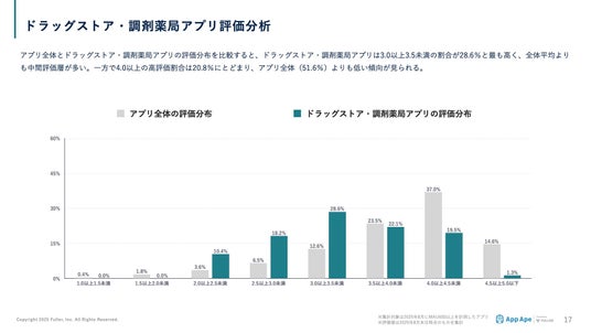 アプリ全体とドラッグストア・調剤薬局アプリの評価分布を比較すると、ドラッグストア・調剤薬局アプリは3.0以上3.5未満の割合が28.6%と最も高く、全体平均よりも中間評価層が多いことが分かります。一方で4.0以上の高評価割合は20.8%にとどまり、アプリ全体(51.6%)よりも低い傾向が見られました。