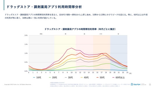 ドラッグストア・調剤薬局アプリの時間帯別利用率を見ると、全世代で朝6~8時台から上昇し始め、10時から12時にかけてピークを迎えます。60代以上は午前の利用が特に高く、18時以降に一気に利用が減少しています。