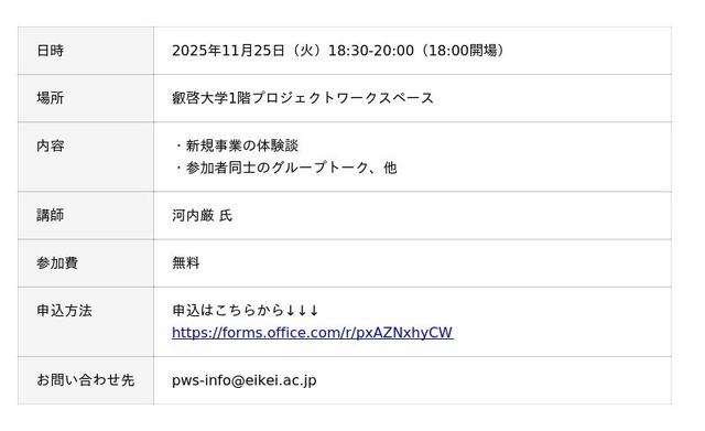叡啓大学(学長:有信睦弘、広島市中区)は、2025年11月25日(火)、叡啓大学のプロジェクトワークスペースにて、PWS月次イベント「After Hours Innovation Talk ~元シャープのマーケターと語る、新規事業のリアル~」を開催します。講師は、シャープ株式会社で25年以上マーケティング、商品企画、ブランディングを担当し、「新プロジェクトX」でも紹介されたカメラ付きケータイやスマホ等100機種以上を市場へ送り出した河内厳さん。