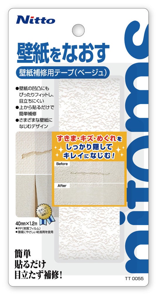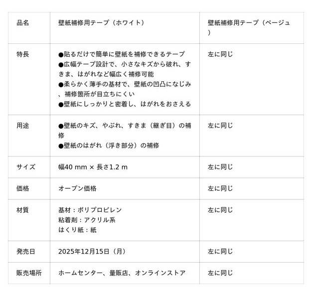 壁紙にできた小さなキズや破れ、すきま、はがれなど、さまざまな悩みを“貼るだけ”で手軽に解決できる壁紙補修用のテープです。当社が実施したアンケートでは、壁紙で補修したい箇所として、1~2cm程度のキズや破れ、すきま、はがれなどが特に多く挙げられていることがわかりました。様々な状況に柔軟に対応するため、開発した本製品は、広幅テープ仕様により、一般的な小さめのシールタイプの補修材では対応が難しかった縦長の傷みや大きめのキズ、すきまを簡単に補修することが可能になりました。また、しっかりと密着することで、壁紙の浮きやはがれも抑えることもできます。壁紙の凹凸にしっかりと追従する柔らかく薄手の基材を採用し、表面には、様々な色・柄になじむモザイク印刷を施しているので、補修後も違和感のない自然な仕上がりを実現します。ホワイト系の壁紙にあわせやすいホワイトとベージュ系の壁紙に調和するベージュの2色展開です。【対応可能な壁紙の損傷例】