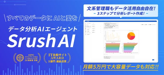 「先月の売上は?」「どの商品が不調?」と話しかけるだけで、 社内の分散データを瞬時に分析し、グラフ付きレポートで即座に回答するAIエージェント「SrushAI」をお試しいただけます。