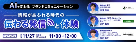 ブランドと社会をつなぐ伴走型コミュニケーションカンパニーとして、戦略設計からWeb、SNS、動画などコンテンツにまつわるあらゆる施策を提供する株式会社4X(本社:東京都千代田区、代表取締役社長:家口 寛、以下「4X」)は、11月27日(木)11時~開催のウェビナー「AIで変わるブランドコミュニケーション 情報があふれる時代の“伝わる発信と体験”」へ登壇いたします。