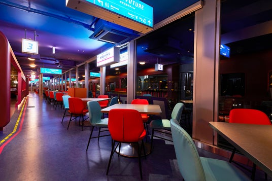 役目を終えた特急サンダーバード(681系)をアップサイクルしたアート空間である先頭車両と、その後ろに続くホームに停車している列車をコンセプトにしたポップでカラフルな店内空間でお食事を楽しめます。
