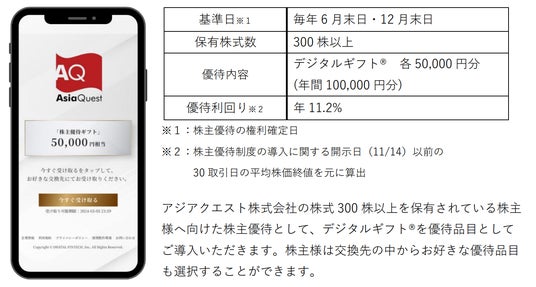 アジアクエスト株式会社(代表取締役社長:桃井 純、東証グロース市場:証券コード4261)において、株式会社デジタルプラス(代表取締役社長:菊池 誠晃、本社:東京都渋谷区、東証グロース市場:証券コード3691)グループが運営する「デジタルギフト(R)」を株主優待としてご活用いただくことになりました。