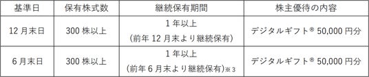※3:但し、株主優待制度導入初回である2026年6月末日の基準日においては、2025年12月末日より継続保有(6カ月以上継続して保有)