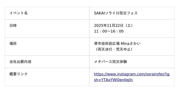 株式会社Meta Heroes(本社所在地:大阪府大阪市、代表取締役:松石和俊、以下「当社」)は、2025年11月22日(土)に堺市役所前広場Minaさかいにて開催される、体験型防災イベント「SAKAIソライロ防災フェス」に、ゲーム感覚で学べる「防災メタバース」の体験ブースを出展いたします。