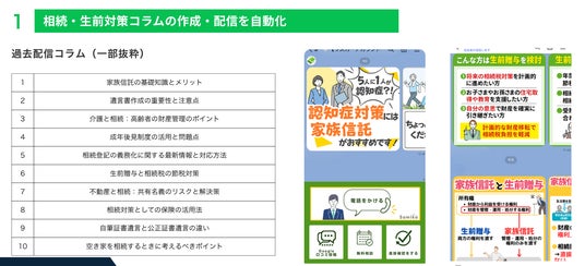1. 相続業務に特化した専門コラムの作成・配信代行一般的なマーケティングツールとは異なり、相続・生前対策に特化したメルマガやコラムをすぐに配信できるコンテンツを標準搭載。
