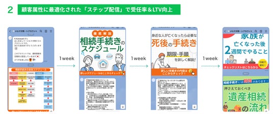 2. ステップ配信による受任率・LTV最大化貴社CRMシステムと直接連動させ、「子ども(相続人)なし」「相続関係複雑」など顧客属性に合わせたステップ配信が可能になり、面談誘導率・受任率の向上が期待できます。