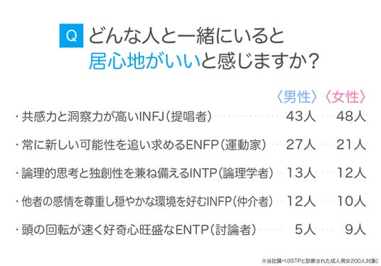 ISTP(巨匠)と診断された成人男女200人に、どんな人と一緒にいると居心地がいいか尋ねたところ、最も多かったのは「共感力と洞察力が高いINFJ(提唱者)」でした。