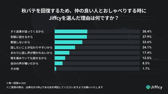 さらに、「秋バテを回復するため、仲の良い人とおしゃべりする時にJiffcyを選んだ理由は何ですか?」という質問に対して、最も多かった回答は「すぐ返事が返ってくるから」(38.4%)、続いて「気軽に話せるから」(37.9%)、「緊張しないから」(32.6%)となりました。