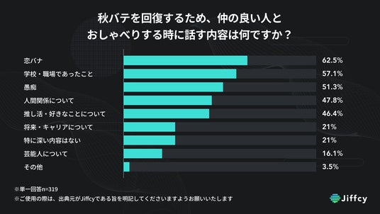 「秋バテを回復するため、仲の良い人とおしゃべりする時に話す内容は何ですか?」に対して、「恋バナ」が62.5%になりました。続いて「学校や職場であったこと」(57.1%)、「愚痴」(51.3%)という結果となりました。