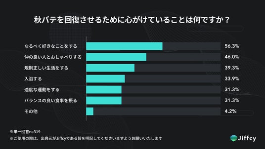 「秋バテを回復させるために心がけていることは何ですか?」という質問に対して、一番多かった回答は「なるべく好きなことをする」(56.3%)、次に「仲の良い人とおしゃべりする」(46.0%)という結果となりました。