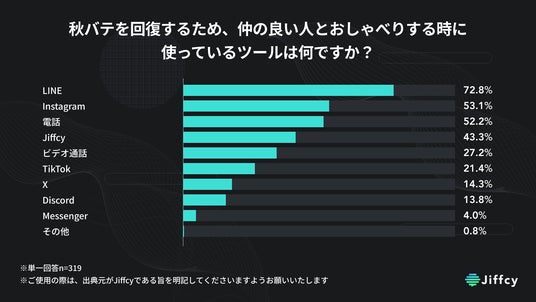 「秋バテを回復するため、仲の良い人とおしゃべりするときに使っているツールは何ですか?」という質問をしたところ、一番多かった回答は「LINE」(72.8%)、続いて「Instagram」(53.1%)、「電話」(52.2%)、「Jiffcy」(43.3%)となりました。