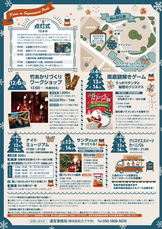 今年度、三重県松阪市は市制20周年を迎え、その記念とみえ松阪マラソン応援企画として、「松阪の一夜inクリスマスナイト」を鈴の森公園にて開催いたします。(株式会社カブクがプロデュースを手がける)市内小学生の「年に一回のクリスマスにきれいなクリスマスツリーをみたい」という提案から、松阪市文化財センターにある22メートルのメタセコイアの木がクリスマスツリーに変身。ツリー周辺にもイルミネーションを設置し、期間中は毎日点灯します。週末には謎解きイベントや、サンタクロースからのクリスマスプレゼントの配布など、楽しいイベントが盛りだくさんで、寒い中でも心も体も温まる時間をお過ごしいただけます。