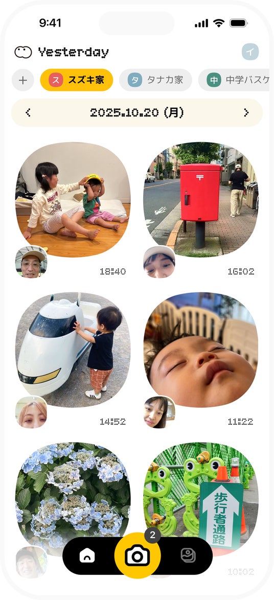 ・撮った写真を複数グループへ同時投稿でき、共有が手軽に