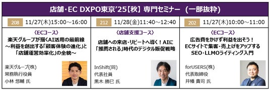 本展では、業界の有識者を講師に招いた「専門セミナー」も同時開催する。ECコースでは、楽天グループ(株) 常務執行役員 小林悠輔氏が、約70のサービスを提供する楽天グループ内で推進するAI活用戦略の全体像と、楽天市場におけるユーザー・出店者向けのAI活用施策を紹介。また店舗支援コースでは、売上に直結する広報・販促支援を行うInShift(同) 代表社員 黒木勝巳氏が、6大SNSやHP、ポータルサイト等を活用し、店舗集客を最大化するためのWeb販促戦略を解説する。他にも売上・集客アップを目指す小売業・飲食業・ECのプロ必聴のセミナーが多数開催される。