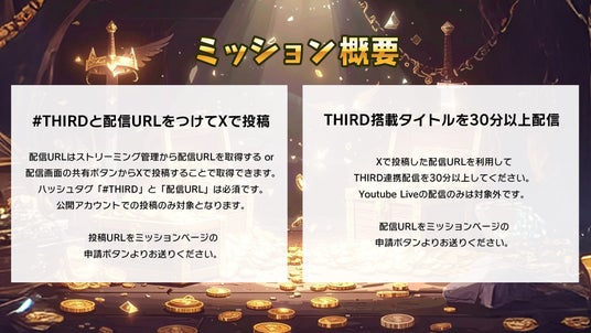 - THIRD搭載タイトルを30分以上配信(Youtube Live / Twitch配信のみは対象外です。)