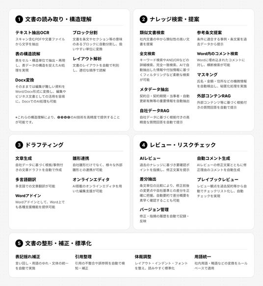 「LAWGUE」は、文書作成をあらゆる面からサポート・効率化するAIを搭載したクラウドドキュメント ワークスペースです。過去文書をアップロードするだけで、自社ノウハウがデータベース化され、AIのサポートによる様々な検索機能、体裁の自動補正などの編集アシスト、クラウド上でのコミュニケーション等により、ワンストップで従来の文書業務における非効率な作業をなくします。現在は、契約書・規程類・仕様書等、様々な文書を対象に企業、法律事務所、官公庁・自治体現場における文書業務の効率化を実現しています。