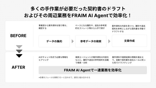AIを搭載したクラウドドキュメントワークスペース「LAWGUE」を提供するFRAIM株式会社(本社:東京都渋谷区、代表取締役社長:宮坂豪、以下「FRAIM」)は、企業の文書作成・レビュー・ナレッジ活用をAIで加速する新ソリューション「FRAIM AI Agent」をリリースしました。