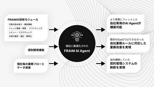 「FRAIM」はこれまで、契約書・規程・社内文書といった企業文書を対象に、積極的な技術開発やサービス運営を通じて、独自の文書処理基盤を構築してきました。主力サービスの「LAWGUE」は、2018年からサービスを展開し、様々な企業・士業・官公庁等の文書作成・レビュー・ナレッジ活用を支援して参りました。「FRAIM AI Agent」は、支援実績に基づく専門知と技術資産を“手足”として自在に組み合わせて活用できる、実務現場に最適化されたAIエージェントです。