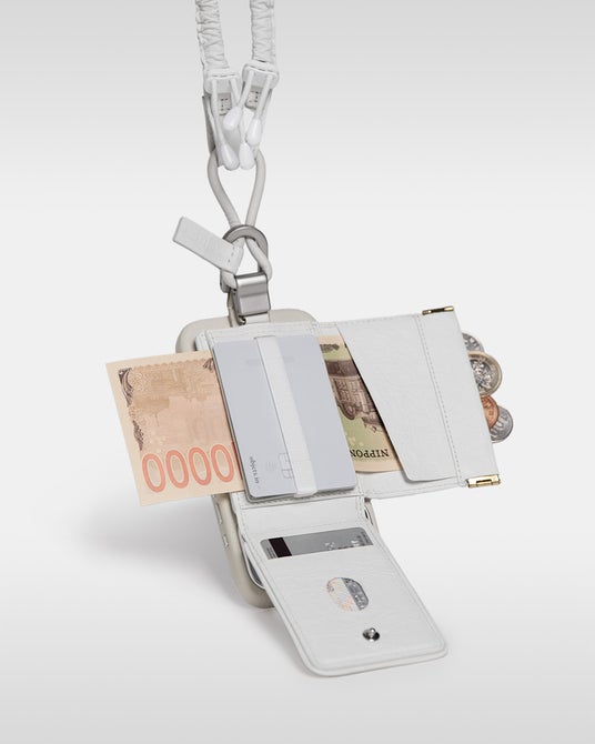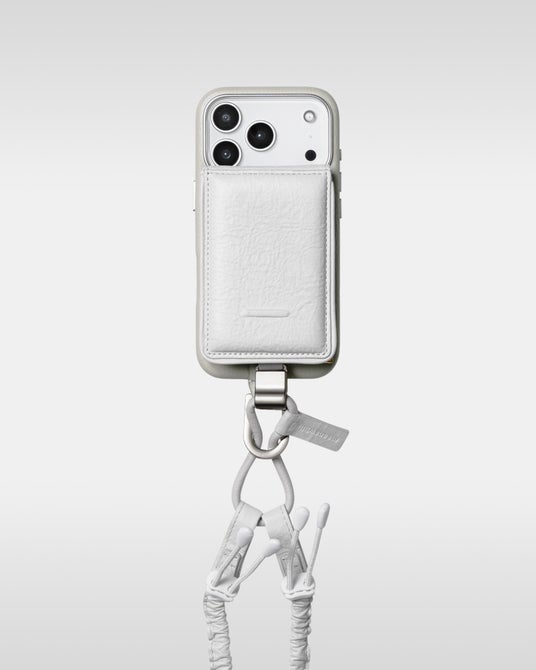 その思想をプロダクトとして体現することを目指し、meanswhileのデザイナー・藤崎尚大氏とobjcts.ioのデザイナー・角森智至の対話から始まった本コラボレーション。meanswhileのバッグ・objcts.ioのiPhoneアクセサリーを、両デザイナーが相互に再解釈・再編集したラインナップが完成しました。デジタルデバイスの筐体からインスパイアされた潔いホワイト、シックなスタイリングにもマッチするブラックの2カラーで展開します。