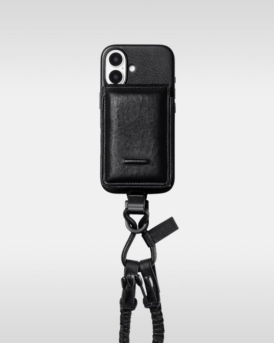objcts.ioのMagWearシリーズを、meanswhileのデザイナー・藤崎氏が再解釈。アウトドアやミリタリーのシーンでも使用されるバンジーリーシュコードから着想を得たmeanswhileのアーカイブプロダクト”Bungee Leather Neck Strap”のデザインを引用しています。「命綱」・「落下防止具」として発展したバンジーリーシュコードを製品に採用し、スマートフォンと身体を接続するイメージを体現。「持ち運ぶ」を「纏う」という行為へ進化させ、単なる携帯手段を超えたファッション性のあるプロダクトに仕立てました。