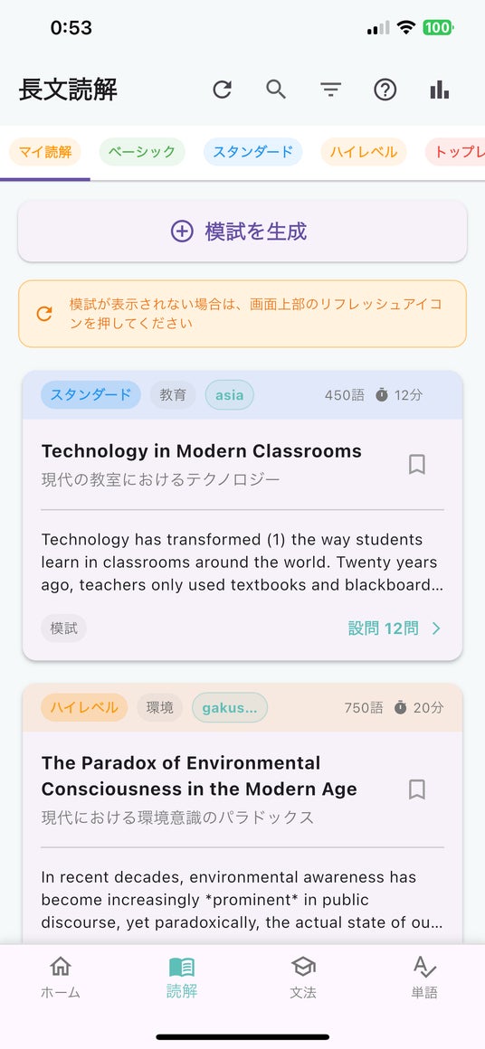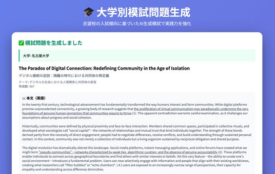 AI生成模試の例実際の入試問題と同レベルの英文読解問題を生成。例えば「The Paradox of Digital Connection: Redefining Community in the Age of Isolation」といった、現代社会の課題を扱った高度な長文読解問題を提供。
