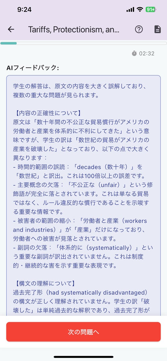 解答後は即座にAIが採点し、詳細なフィードバックを提供。翻訳の正確性だけでなく、文構造の理解度まで分析。