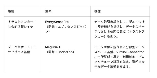 - EverySensePro:企業・自治体・研究機関が保有するデータを安全・効率的に流通させるB2Bデータマーケットプレイス。TTPとの活用によりデータ発見、契約、決済、監査を統合。- Meguru-X:データ主権を担保する分散型データスペース基盤。Virtual Connector、Data Certification、Usage Control、Zero Trust設計により、主権保持型データ連携を実現。