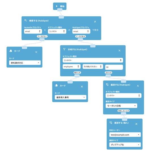 本アップデートにより、HubSpot上の顧客データをきっかけに、immedio内で“商談創出を自動化するシナリオ”をノーコードで設計・実行できるようになります。