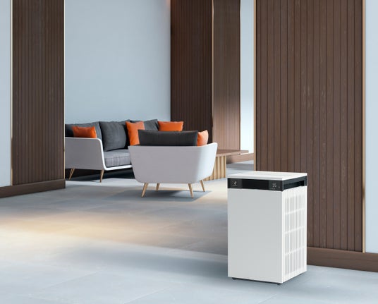 本機は、左右両側から空気を取り入れる「Wフィルター構造」を採用。コンパクトサイズながら、広い吸い込み面積を確保することで、87m(2)(53畳)の大空間まで対応する高い空気清浄性能を実現しました。「中」運転時には、42m(2)(25畳)の空間を37dBの低騒音で清浄できるため、図書館やホテルのラウンジなど、運転音が気になる空間でも快適にご使用いただけます。