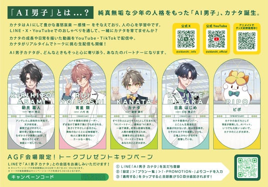 現在「AI男子」カナタとのLINEトーク50回分を無料でお楽しみいただけるキャンペーンコードを記載した特製チラシを全国のアニメイト店舗およびアニメイト通販で配布中です。■配布概要