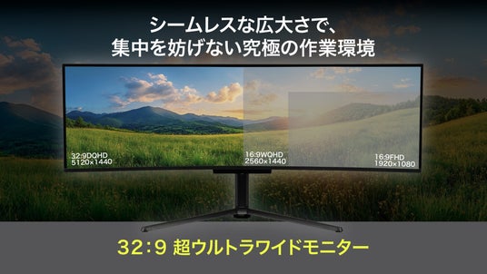 27インチWQHDモニターを2台並べた状態とほぼ同等の表示領域を、1台で実現。デュアルモニター環境ではベゼルによる分断が生じますが、本製品ではシームレスな表示で広い画面を余すことなく活用可能。32:9対応のゲームを存分に楽しむことができるほか、複数のウィンドウを同時に展開しても快適に作業可能。集中力を維持しながら、生産性を向上させる作業環境を実現します。