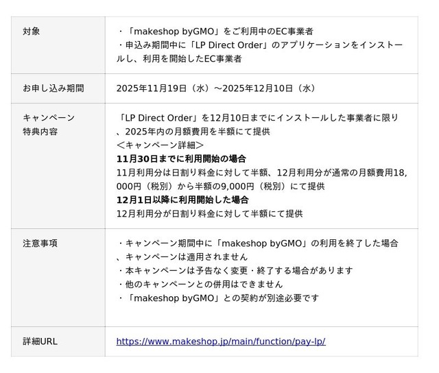 GMOインターネットグループのGMOメイクショップ株式会社(代表取締役社長CEO:向畑 憲良、以下、GMOメイクショップ)は、2025年11月19日(水)より、「makeshop byGMO」において、決済フォームを組み込んだLP(ランディングページ)を簡単に作成できる新アプリケーション「LP Direct Order」の提供を開始いたします。これにより、集客から購入までを1ページで完結させ、スムーズな購買導線とコンバージョン率の向上に寄与します。