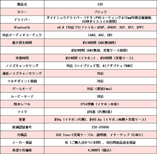 公式ページ:https://jp.soundpeats.com/products/c30