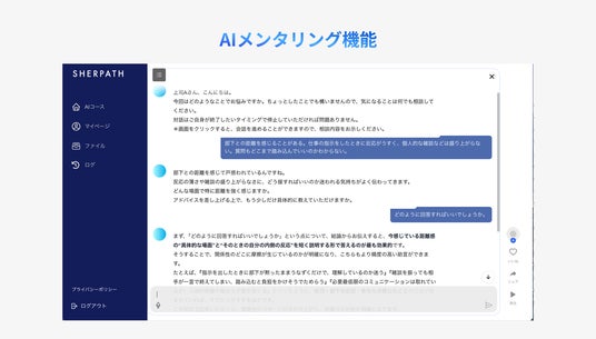 学びを実践しようとする時に生まれる疑問や悩みに、研修内容とその理論を学習したシェルパが、具体的にアドバイスを行うのがAIメンター機能。