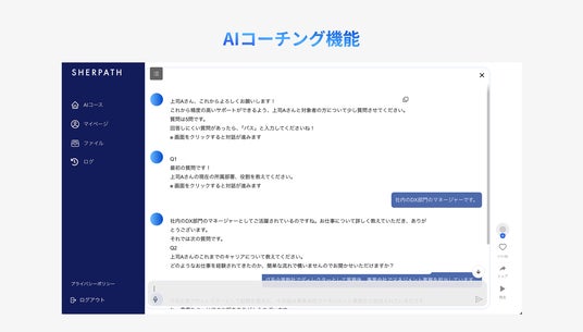 AIシェルパは研修内容に関する理論と受講者のプロファイルを事前に学習したうえで、受講者がコーチング・メンタリングを受けた際のデータも学習し続けることで、人財育成・組織開発のテーマに沿い、個に最適化されたパートナーとして伴走するという特徴があります。