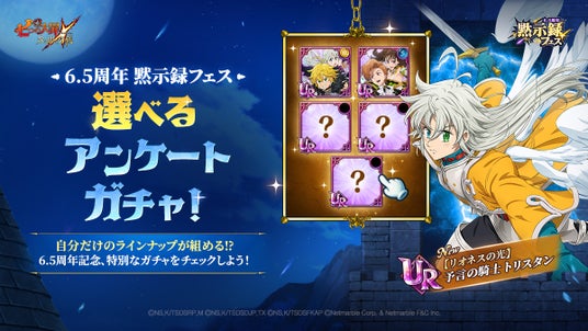 【リオネスの光】予言の騎士 トリスタン等が登場する、「6.5周年黙示録フェス:選べるアンケートガチャ」を開催いたします。今回はガチャの一部ラインナップを自分で選択して決めることができる特別なガチャです。回数に応じて貯まるマイレージ報酬では、900マイレージ到達で新キャラまたはURキャラ4体の中から1体を選んで獲得できます。この機会にぜひ手に入れてください。
