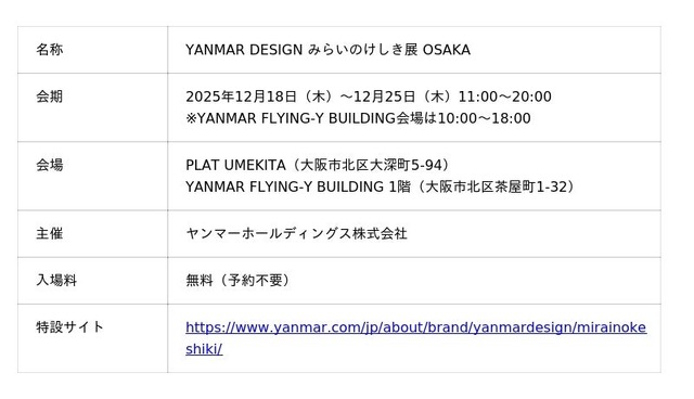 ヤンマーホールディングス株式会社は、2025年12月18日(木)から12月25日(木)まで、大阪・うめきたエリアの複合施設「PLAT UMEKITA(プラットウメキタ)」とヤンマー本社ビル「YANMAR FYLING-Y BUILDING」1階にて、ヤンマーが取り組んできたデザインの歩みと、デザインで描く未来の“けしき”を紹介する展覧会「YANMAR DESIGN みらいのけしき展 OSAKA」を開催します。