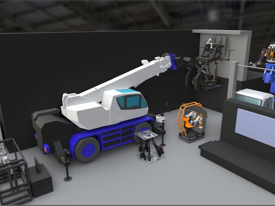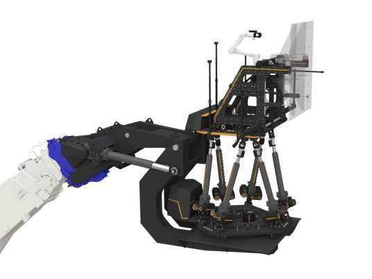 重量物のハンドリング作業の機械化を目的とした、株式会社竹中土木と共同開発中の PoC 試作機。一つの天板を 6 本の電動シリンダで支えるパラレルリンク構造を採用することで、一般的なロボットアーム(シリアルリンク構造)と比較し、高出力・高剛性と巧緻さを両立しています。本展示では、実証試作機である ver.2.0 を株式会社タダノ製 16 ton ラフテレーンクレーンの先端に搭載し、人機操作機からの遠隔操作で橋梁耐震補強ブラケットの取付作業デモンストレーションを実施します。さらに、原理試作機である ver.1.3 を同時展示します。ver.1.3 では、GSP 上の操縦桿からの直接操作体験を実施します。詳細は下記関連プレスリリースを御覧ください。
