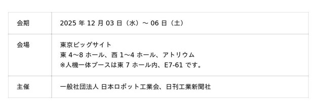 株式会社人機一体(本社:滋賀県草津市、代表取締役:金岡博士、以下「人機一体」)は、2025 年 12 月 03 日(水)から 06 日(土)に東京ビッグサイトで開催される世界最大級のロボット専門展「2025 国際ロボット展(以下、iREX2025)」にリアル出展します。前回の 2023 国際ロボット展(iREX2023)の 30 小間から 10 小間増床し、40 小間での大型展示となります。