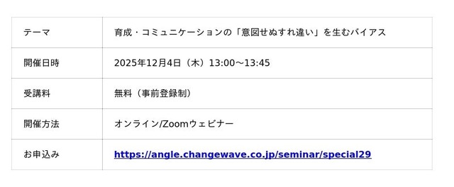 本セミナーでは、「ANGLE*」を用いて個人の傾向や上司・部下の認識ギャップ、組織文化に潜むバイアスを可視化することで、対話と変化を生む状態をどうつくるのか、企業事例を交えて紹介します。