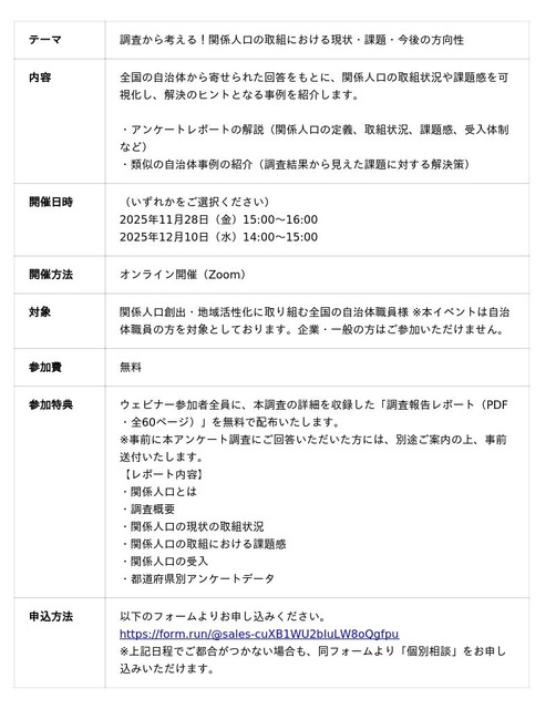関係人口創出に関心のある自治体の皆さまのご参加を心よりお待ちしております。